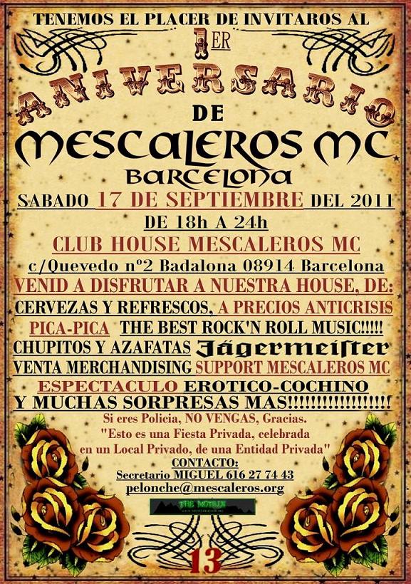 Nos complace invitaros a nuestro 1er Aniversario Mescaleros MC Barcelona que se celebrara el 17 de Septiembre de 2011 a partir de las 18.00 h. en C/ Quevedo nº 2 de Badalona