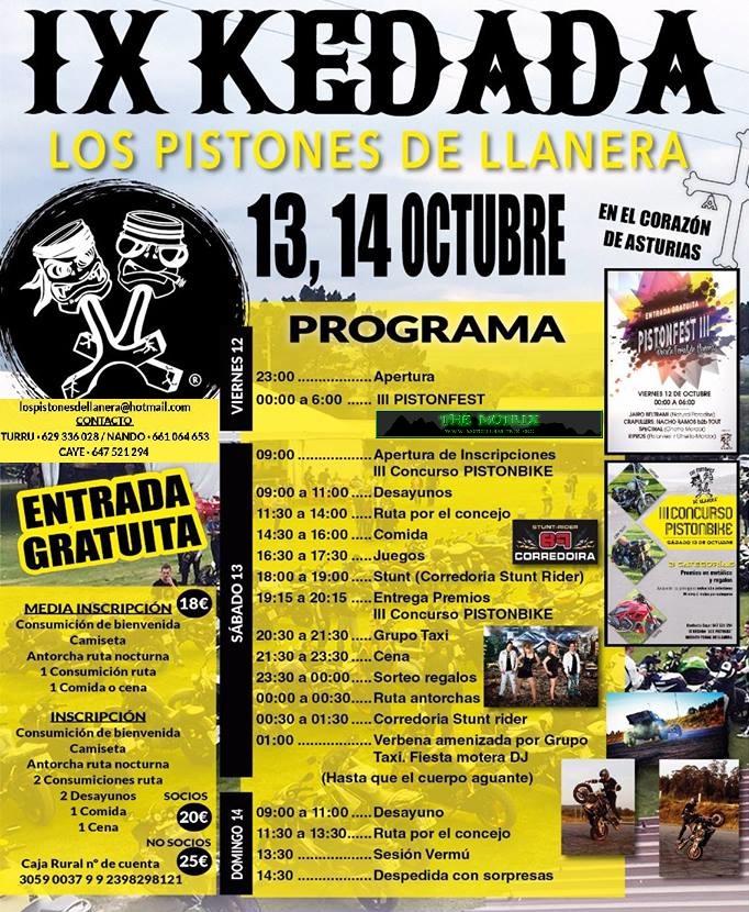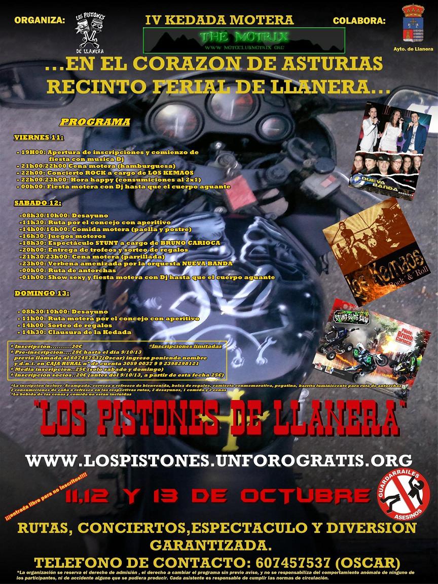 Hola chic@s, aquí os dejo el cartel y el programa de nuestra 5ª KEDADA MOTERA "LOS PISTONES DE LLANERA"...en el corazón de Asturias