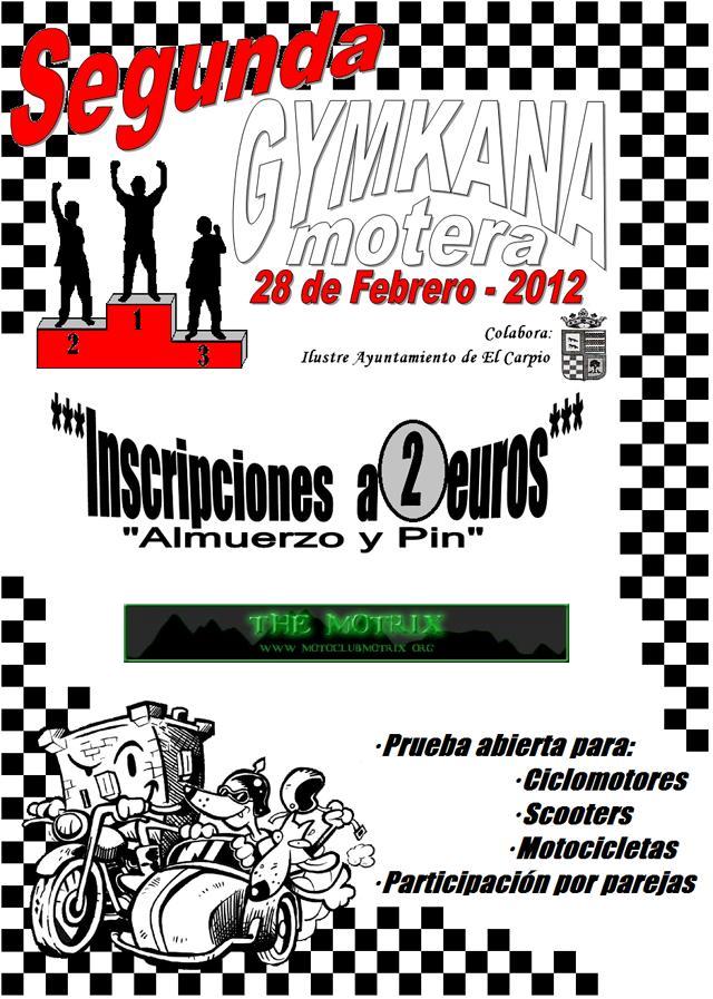 Para el dia 28 Feb. dia de Andalucia, hemos organizado la 2ª GYMKANA 2012, en El Carpio (Córdoba) la inscripcion sera solo de 2 € con pins de regalo, comida, trofeos para 1º 2º 3º Clasificado.