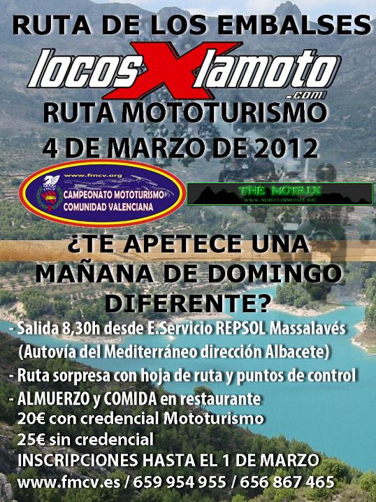 El motoclub LocosXlaMoto, ha preparado la Ruta de los Embalses, como ediciones anteriores, la ruta pretende recorrer como su nombre indica, parte de los embalses más emblemáticos de la Comunidad Valenciana, adjunto cartel publicitario,