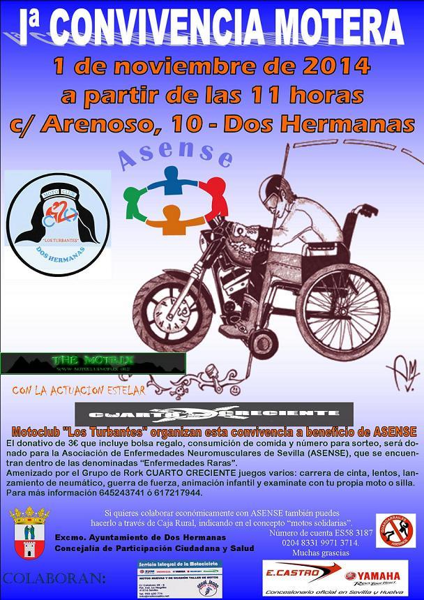 Concentración motera a favor de de ASENSE (Enfermedades Raras) con el donativo de 3 Eurillos te regalas una camiseta conmemorativa del evento un plato a elegir, una bebida y un numero para un sorteo. Juegos varios tales como lanzamiento de neumático, carrera de cinta, guerra de fuerza con cuerdas y examinarte con tu propia moto o silla . Todo amenizado por el grupo de Rock CUARTO CRECIENTE