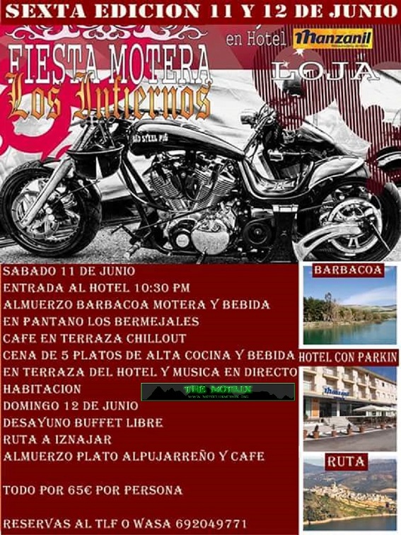 Sábado 9 de junio ruta baritima continuaremos con un gran almuerzo y toda la bebida incluida y a continuación una gran fiesta rompiendo esquemas Motor Show con actuaciones de un gran artista con su batería acústica tocando los mejores temas más conocidos por todo un gran espectáculo de fuego y como no con gogós masculino y femenino qué no harán pasar muy buenos momentos seguiremos con una cena todo lujo y toda la bebida incluida que nos caracteriza a los infierno y después una gran fiesta con nuestro DJ Vitor huertas motero y show erótico nunca visto todo esto en un hotel de 3 estrellas con una vista impresionante de la ciudad de Loja con una instalaciones de lujo