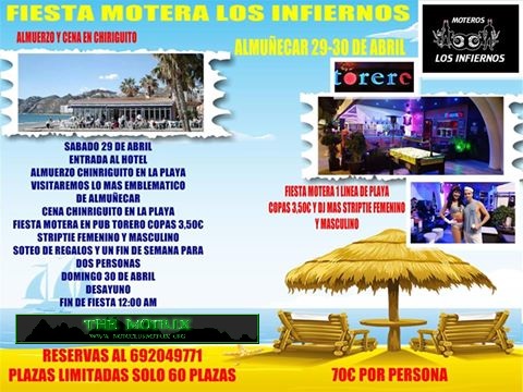Sábado 29 de abril entrada al hotel almuerzo en chiringuito en la playa visitaremos lo más emblemático de Almuñécar Cena en chiringuito de la playa fiesta motera pub torero copas a 3,50 striptie femenino y masculino sorteo de regalo domingo 30 de abril desayuno fin de fiesta a las 12 a.m.