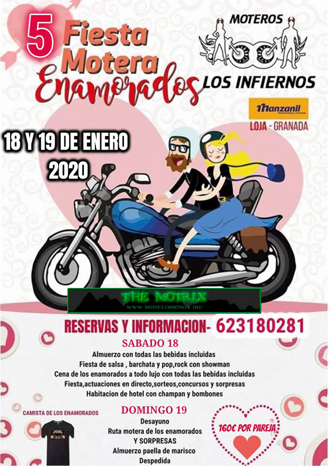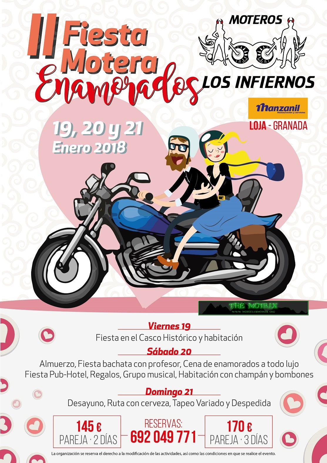 Sábado 20 de enero salida de motos por la ciudad de Loja después almuerzo a continuación fiesta bachata y salsa con nuestros profesores para enseñaros y divertiros ,cena a todo lujo con este menú por persona surtido de embutidos y corazones de canapés corazón de alcachofa con cordón de remolacha roja centro de bacalao a la menta codillo de cerdo deshuesado con tumbet de patatas y verduras corazones de chocolate rellenos de fresa con jarabe de frutos rojos y bebida tinto Rioja Reserva agua cerveza refresco y cava una gran cena de la enamorados a continuación fiesta en el pub del hotel con grupo música en directo regalos , sorpresa habitación de hotel con cava y bombones para todas las parejas