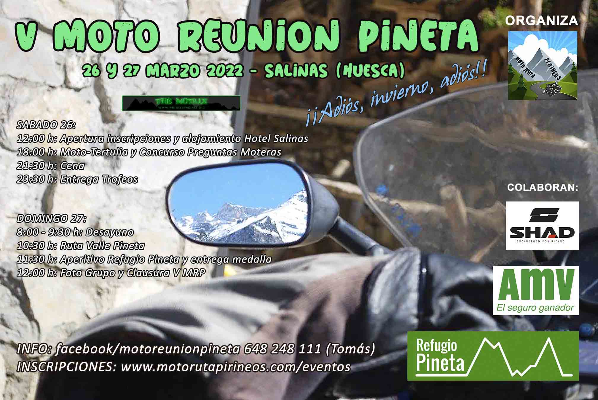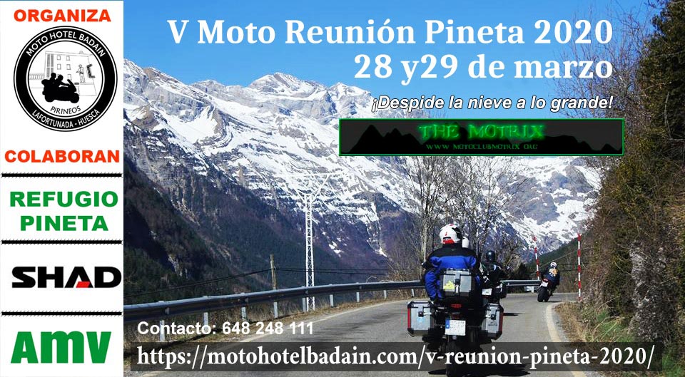 Nuestra V Moto Reunión Pineta, contará con el apoyo del Hotel Restaurante Mesón Salinas y el Refugio de Pineta. En el hotel se cenará, se dormirá y se desayunará. También se realizarán charlas de viajes y sorteo con preguntas moteras.