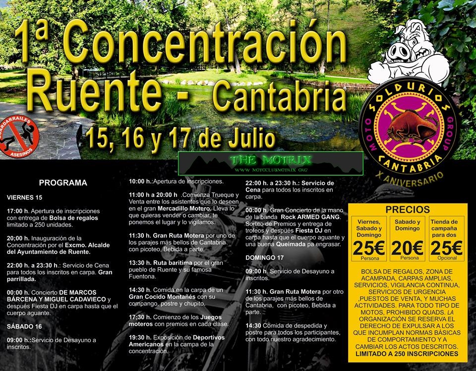 Este Año, preparamos 2 eventos en dos días seguidos, Uno es una quedada que se realizará en Ruente y tiene un costo de 20 €, en el Restaurante Los Molinos de Ruente con una ruta que saldrá a las 11.00 h. en la cual se parará en el Restaurante Parrilla el Carmen donde nos ofrecerán un buen picoteo. luego volveremos a Ruente donde se puede degustar un blanquito de la zona para pasar a comer un buen menú en el restaurante Los Molinos de Ruente donde os entregaremos un pequeño obsequio. A las 17,30 h. nos amenizará el grupo Saco Roto, los Cuales presentan su último disco el 11 de Mayo.