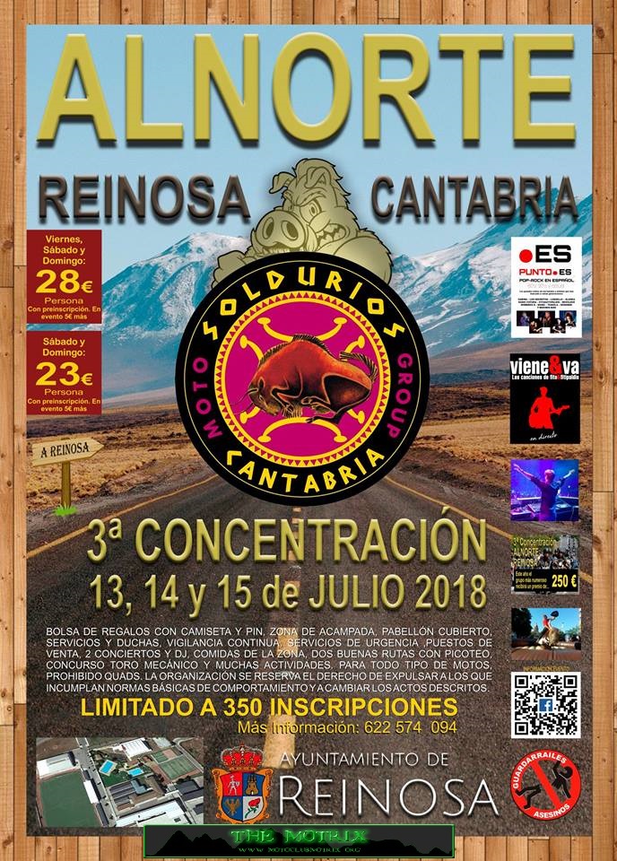 Este año nos trasladamos nuestra Concentración ALNORTE a otra gran villa de Cantabria, capital de Campoo, entrada principal a la estación de esquí del Alto Campoo y por supuesto con grandes servicios y una gran belleza. Disfrutaremos de unas instalaciones magnificas con dos Pabellones, piscinas, espacio verde, buenas comunicaciones, rutas super interesantes, lugares monumentales para los que les guste adentrarse en la cultura local, acampada cubierta, extenso parking para motos, buenas viandas de la zona, por supuesto con todos los elementos necesarios para la comodidades de los asistentes, buenos puestos, buena música para todos los gustos y por supuesto todo nuestro cariño y entrega, como siempre