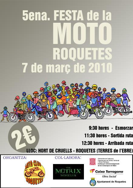 El próximo domingo 3 de marzo organizamos la 8a. Festa Popular de la Moto en Roquetes. Esta Festa está abierta a todo tipo de ciclomotores y motocicletas. El lugar de la concentración será a las 9:30 horas en el Hort de Cruells (Roquetes-Tarragona).