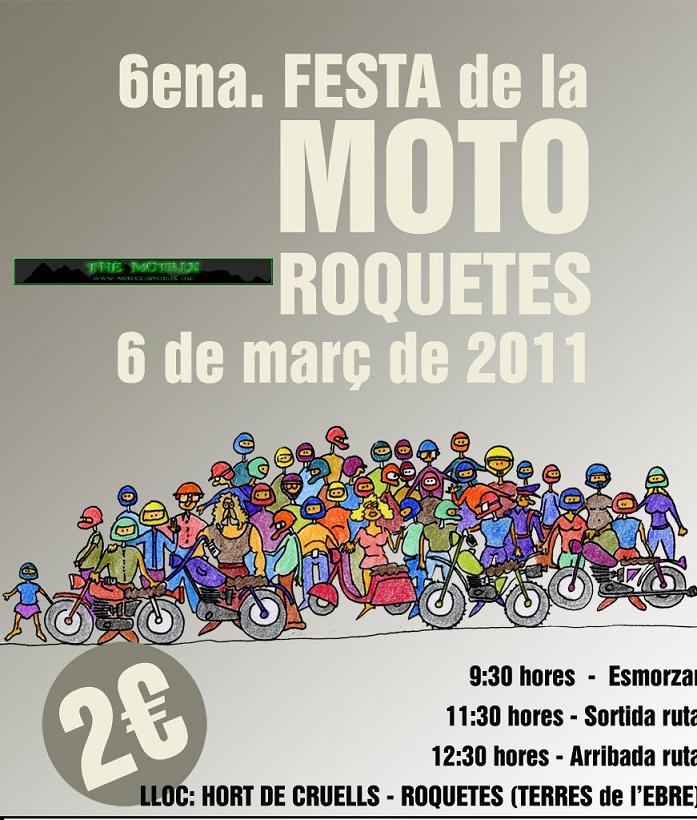 El proper diumenge 6 de març organitzem la 6a. Festa Popular de la Moto a Roquetes. Aquesta Festa està oberta a tot tipus de ciclomotors i motocicletes.