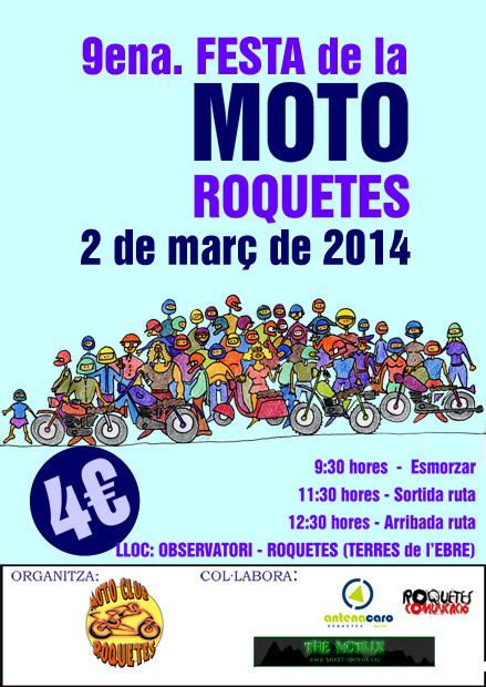 El diumenge 30 de març celebrarem la 3a. Festa Popular de la Moto Roquetes. Aquesta festa popular, organitzada pel Moto Club Roquetes, intenta aplegar el màxim número de motos i motoristes dels voltants per retre homenatge al món de la moto.