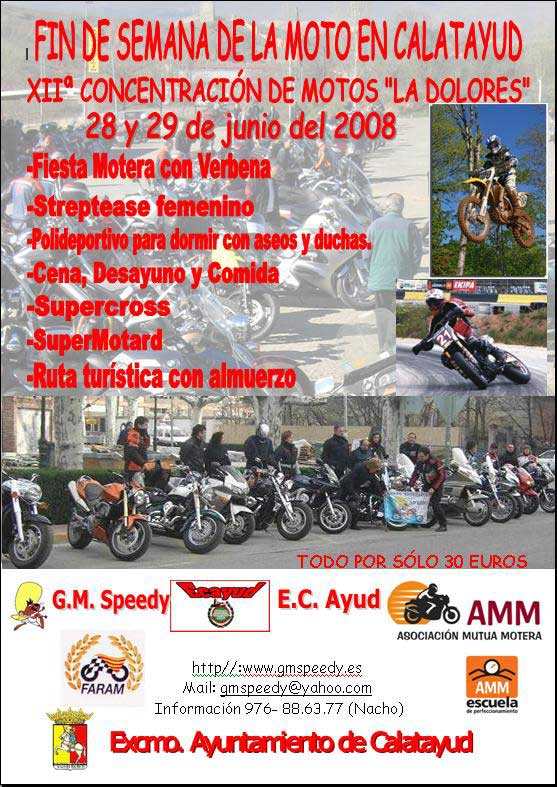 comunicaros que estamos preparando la que va aser la “XIIª CONCENTRACIÓN DE MOTOS “LA DOLORES” quese celebrará en Calatayud (Z) los próximos días 28 y29 de junio del 2008, con el siguiente programa ytodo por el módico precio de 30 euros. Para másinformación visita nuestra web: http://www.gmspeedy.es