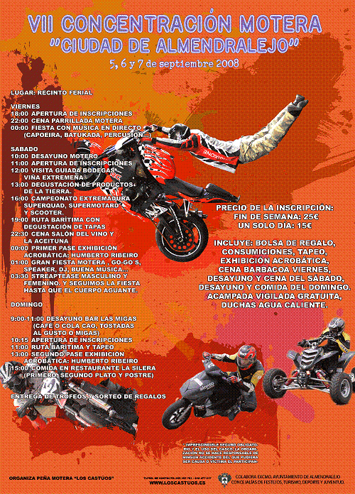No te pierdas la VI concentración Ciudad de Almendralejo, organizada por la pe?a motera ?Los Castuos?, en Almendralejo (Badajoz). Cuesta 25 euros (15 solo el domingo) y dos euros menos si eres socios de Action Team. Solo pagando eso disfrutar?s los dos días de muchas actividades: rutas bar?timas, degustaciones de productos de la tierra, acampada, piscina, dj?s, streaptease, go-go?s, regalos, trofeos, fiesta, exhibición acrob?tica Andr? Colombo?Te encantar?, as? que? ?no faltes! M?s información en los n?meros 616 47 70 17 / 667 68 84 51 / 655 35 57 81.