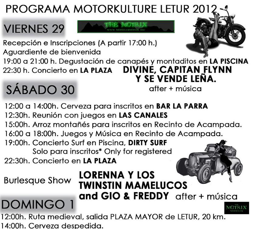 Meeting Motorkulture Alto Segura IV edición . Tendrá lugar los dias 27 - 28 - 29 de Junio en otro pequeño pueblo de la Sierra de Segura LETUR, muy cerca del anterior NERPIO, en el que estuvimos 3 años. El motivo del cambio no es otro que el de seguir los verdaderos instintos iy principios del Motorista, " Ir siempre de Paso ". Conoceremos otro precioso lugar con nuevas gentes y estaremos el tiempo que sea necesaario hasta que se cumpla nuestro objetivo de ver completado un nuevo encuentro intercultural..