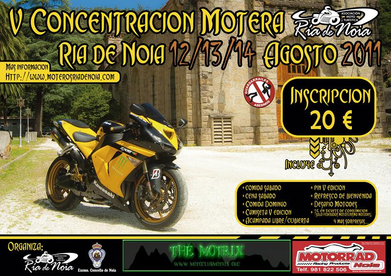 Nos congratula informarles de la próxima celebración, los días 15 y 16 de Agosto de 2008, de la II Concentración Ría de Noia organizada desde el seno de nuestra asociacion. Luego de cosechar tanto éxito el año anterior, intentamos superarnos, como no había de ser de otra manera, y en esta edición decidimos ampliar el calendario de la fiesta para el disfrute de todos vosotros, moter@s y gente de a pie. Contaremos con actividades tanto el Viernes 15, como el Sábado 16. Supermotards, Toro Mecanico, Conciertos de Rock, Exhibición de acrobacias, Musica.. mucha música, Sorteos y mucha mucha fiesta!! Todo esto y mucho más en Noia, recuerda 15 y 16 de Agosto, no te arrepentirás.