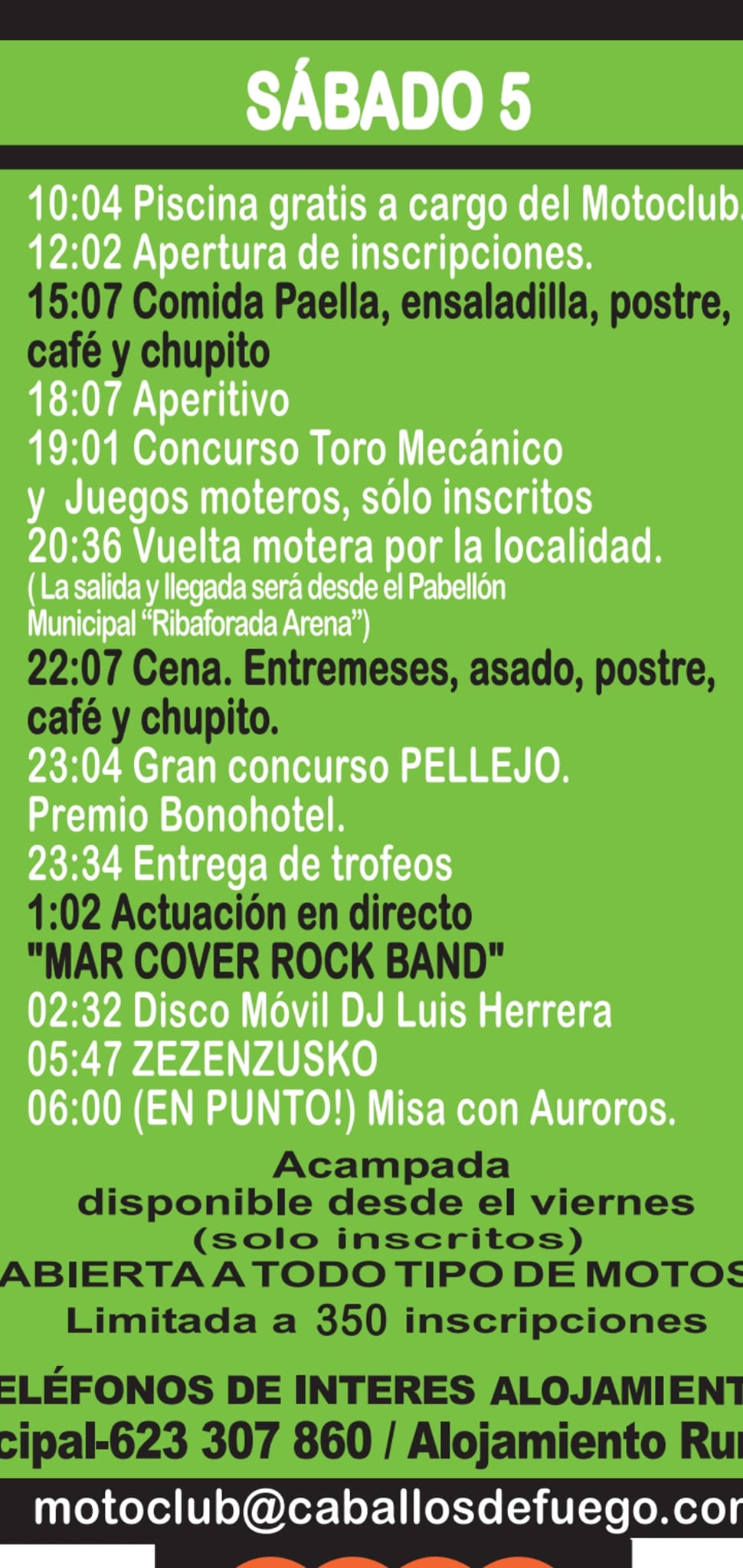 Viernes. Partimos por la tarde Pepemoto y Bulma en su GS y Soraya Y Toninolimits en la R1. Por la mañana se avanzaron Kaisser Xose y Titi en su FJR. Sin excesivo calor en la ruta, por suerte, aunque algo de viento. A nuestra llegada a Ribaforada nos encontramos y hacemos un buen grupo con amigos de Akelarre AM y familia Zara, Ruben, Seila y Jillo, y los Tudelanos Julio y Aintzane. Llegamos a tiempo para acampar en el campo de fútbol con un césped espectacular para ello, e ir a cenar al Pavellón alrededor del cual girará el evento. Buena cena a base de ensalada y estofado (apuntar con bebida, postre y café y chupito en todas las comidas). A continuación bingo. Y remate con concierto y DJ.