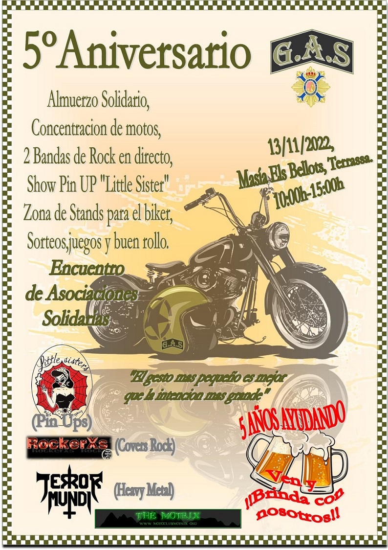Almuerzo Solidario, concentración de motos, Show Pin Up, zona de Stands con artículos americanos y para el motorista, Rock en directo de la mano de Rockerxs (Hard rock covers) y Terror Mundi (Heavy Metal) presentando su disco en directo, zona de juegos, sorteos y mucho más!! en un recinto natural y controlado.