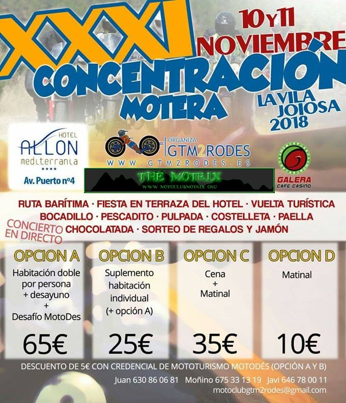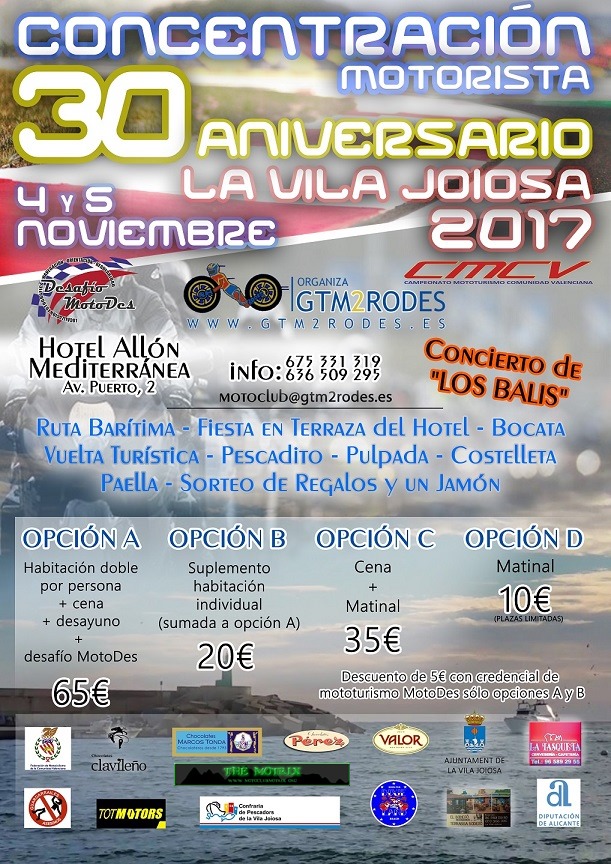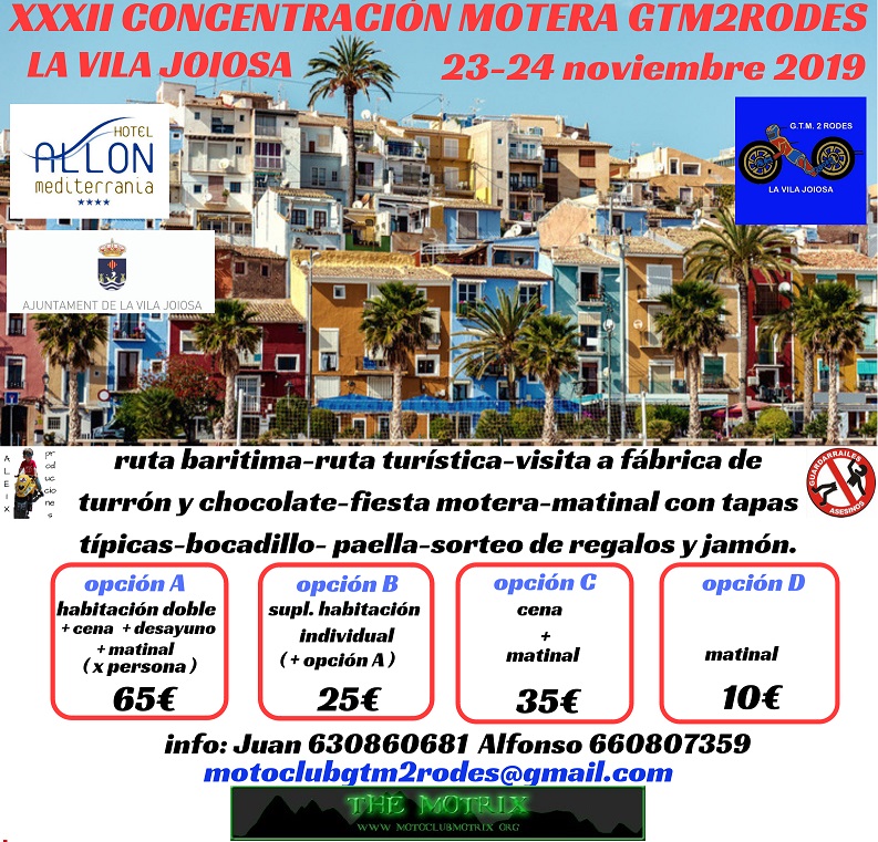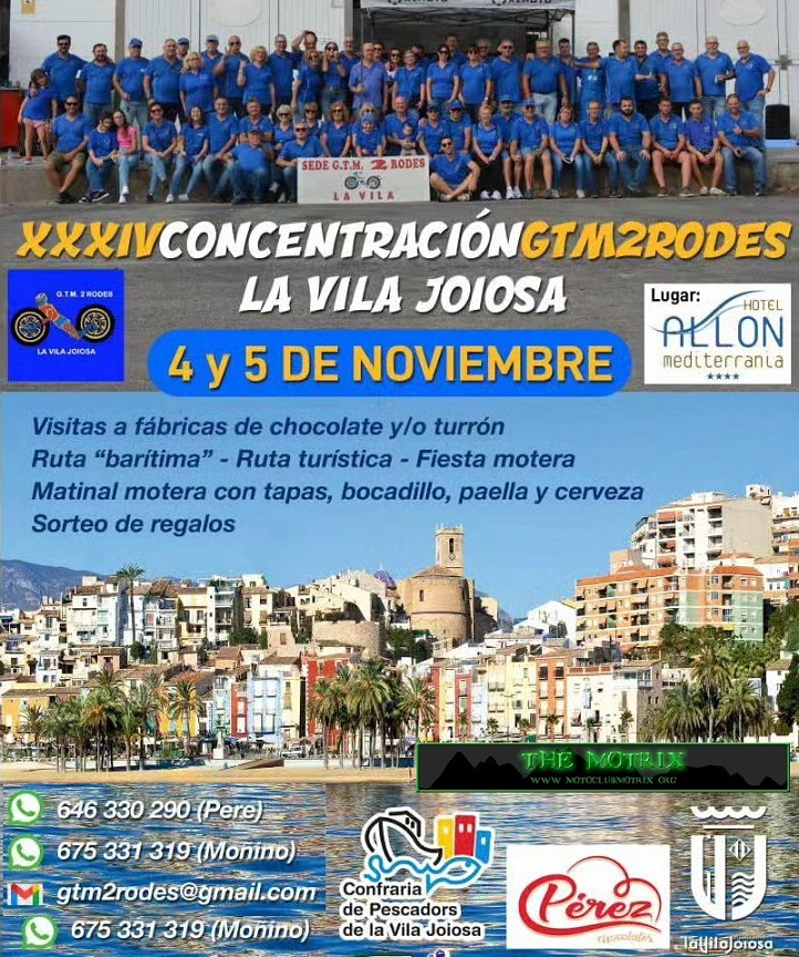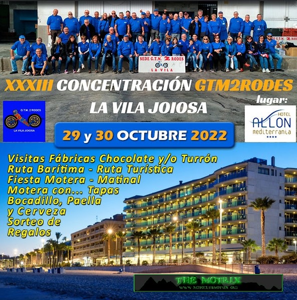 El Motoclub GTM2Rodes La Vila, con el apoyo de la Concejalía de Deportes del Ayuntamiento de La Vila Joiosa, ha organizado la XXVII Concentración motera, que tendrá lugar en la localidad el sábado 15 y domingo 16 de noviembre. Este año, la concentración motera se celebrará en el Hotel Allon, situado en el Paseo Marítimo de La Vila e incluirá entre sus actividades la Ruta del chocolate, por las fábricas locales, Valor, Chocolates Pérez . El desafío MotoDes, en esta ocasión una prueba de Orientación, La Ruta del Chocolate tendrá lugar el sábado 15 a partir de las 18,00 h.