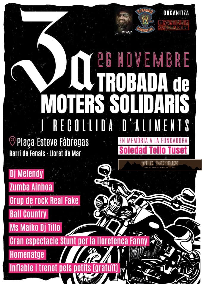Tres Grupos Moteros: Moters de LLoret. YEYE Bikers y Titanes nos unimos por una gran causa Gran recogida de alimentos y lo hacemos en memoria de una de las fundadoras de Moters de lloret, Soledad Tello Tuset Y entre todos le haremos su Homenaje, además todos unidos haremos de este día un gran dia de SOLIDARIDAD porque dadas las circunstancias en la que estamos todos, muchas personas necesitan de ayuda por ello os pedimos, vuestra asistencia y que nos traigáis alimentos. Habrá una carpa de Banco alimentos (Caritas lloret) en la concentración