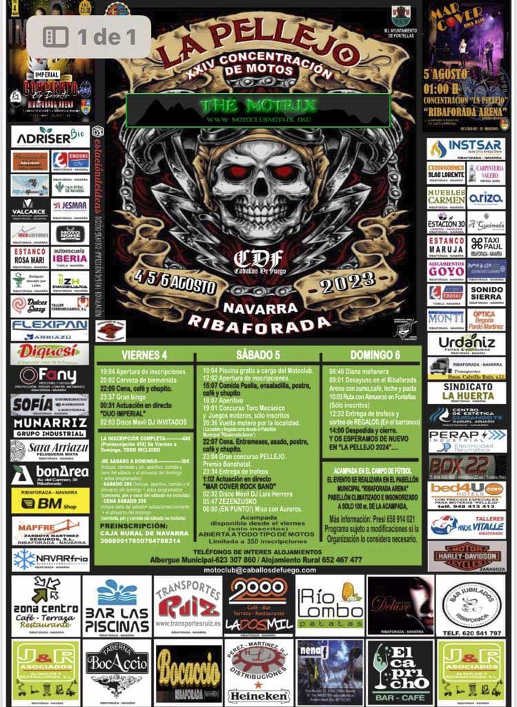 Sábado. Amanece sin prisas, pues no entra hoy el desayuno, y nos lo tomamos con calma en el Bar Jubilados -nos hacemos mayores jeje-, donde echamos buena parte de la mañana. Llegada la hora de comer, paella y heladito. Por la tarde echamos una siesta en las piscinas y tras "picar el hielo" nos metemos en sus aguas frías. Nos visitan Ainoa, Itziar y Sergio de Akelarre AM y familia. Rubén nos deleita con un curso de costura. Risas aseguradas. Volvemos al pabellón donde hay concursos moteros y de toro mecánico. Y la vuelta motera para darnos visibilidad a la localidad. Para dar paso a la cena con pollo asado con patatas. Con los cafés arranca la entrega de trofeos y el concurso de Pellejo que estuvo bien interesante y Aintzane casi se lleva el premio de bono de hotel. A continuación música en directo y DJ. Si bien con el DJ el recinto se vacía, a su cierre aún improvisamos un almuerzo con un miembro de la organización en su merendero, a base de jamón, chorizo y queso y la última cerveza, a lo que desde aquí vuelvo a dar gracias por el momentazo y la acogida.