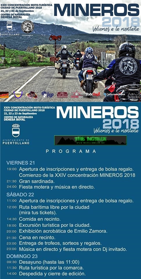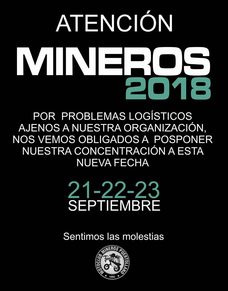 Por necesidades organizativas, la Concedntración Mineros 2016, será los días 26, 27 y 28 de Agosto de 2016.Motrix Reloaded escribió:XXII CONCENTRACION MOTOTURISTICA MINEROS