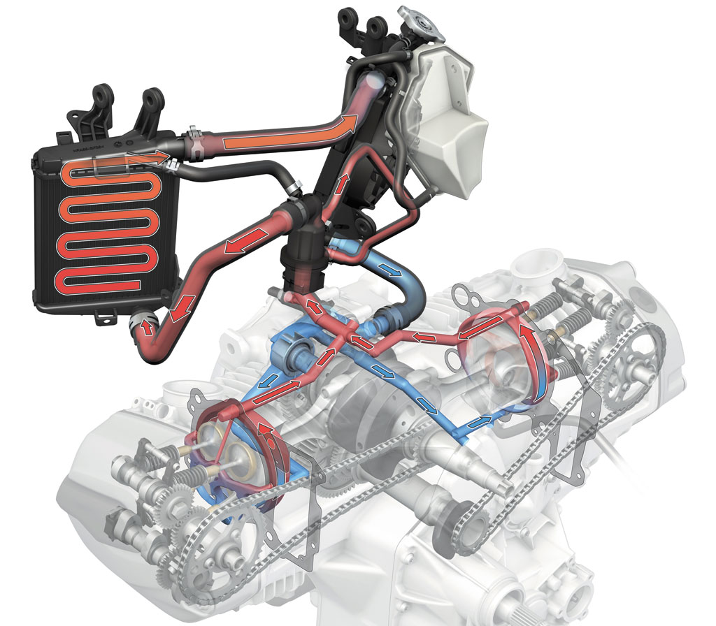 Aquí se puede apreciar el sistema de refrigeración de la R 1200 GS LC. Como veis solo refrigera las cabezas de los pistones con agua y se observa que los cilindros son refrigerados por aire. Es un sistema misto en este modelo , en el anterior era aceite/aire y el de ahora agua/aire.