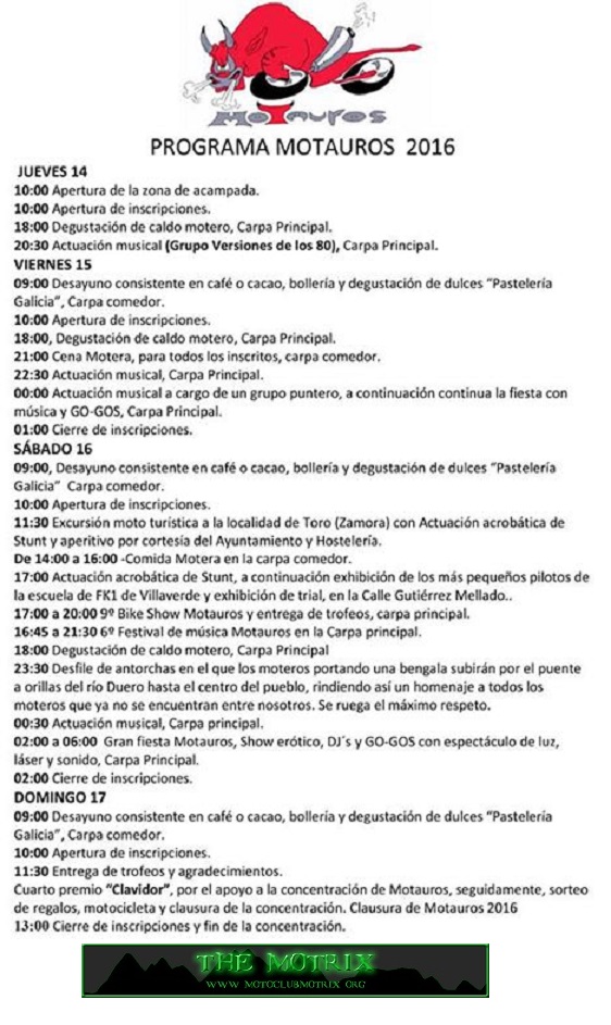 11:30 -Entrega de trofeos y entrega del segundo premio “Clavidor”, por el apoyo a la concentración de Motauros, seguidamente, sorteo de regalos, motocicleta y clausura de la concentración.