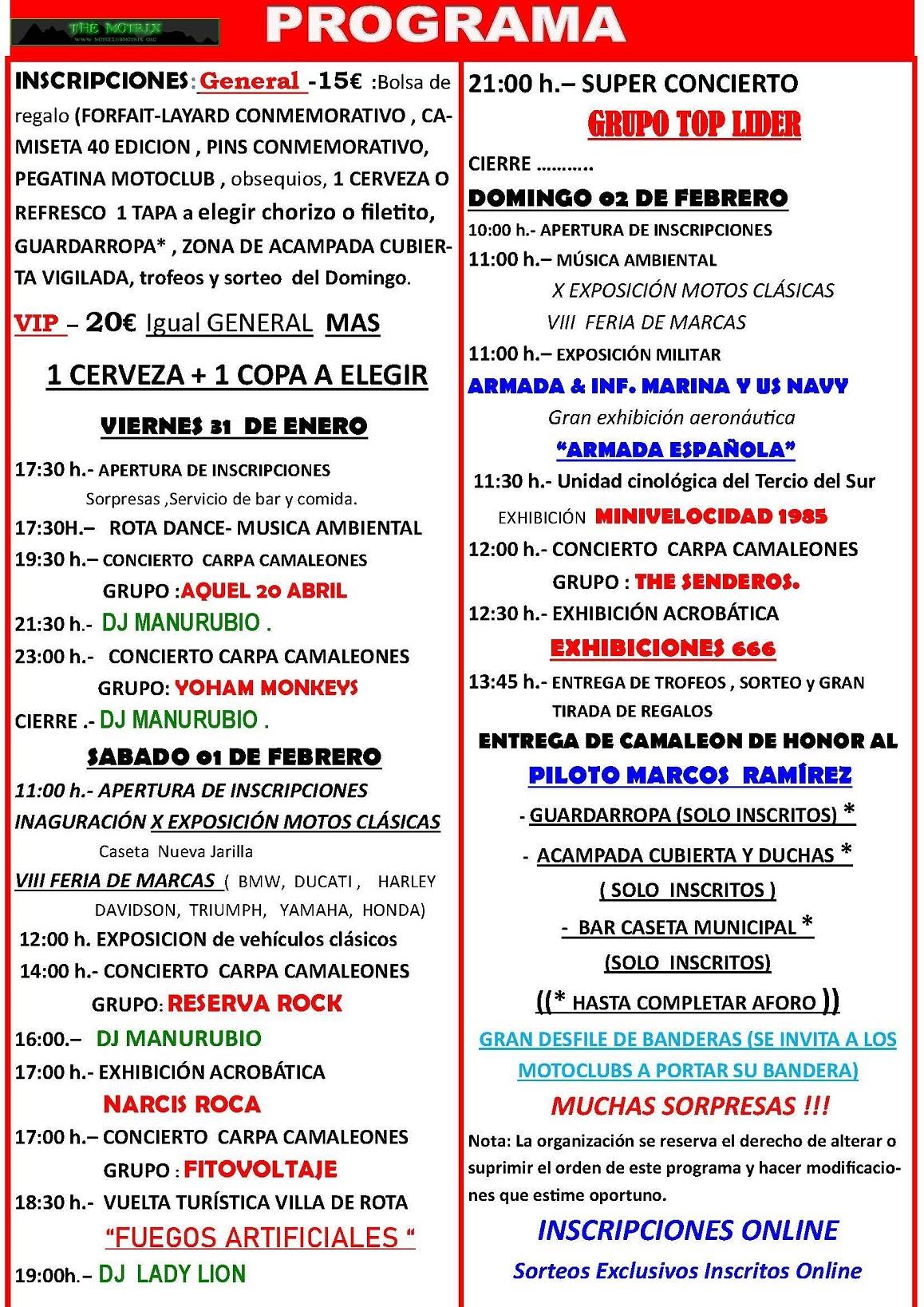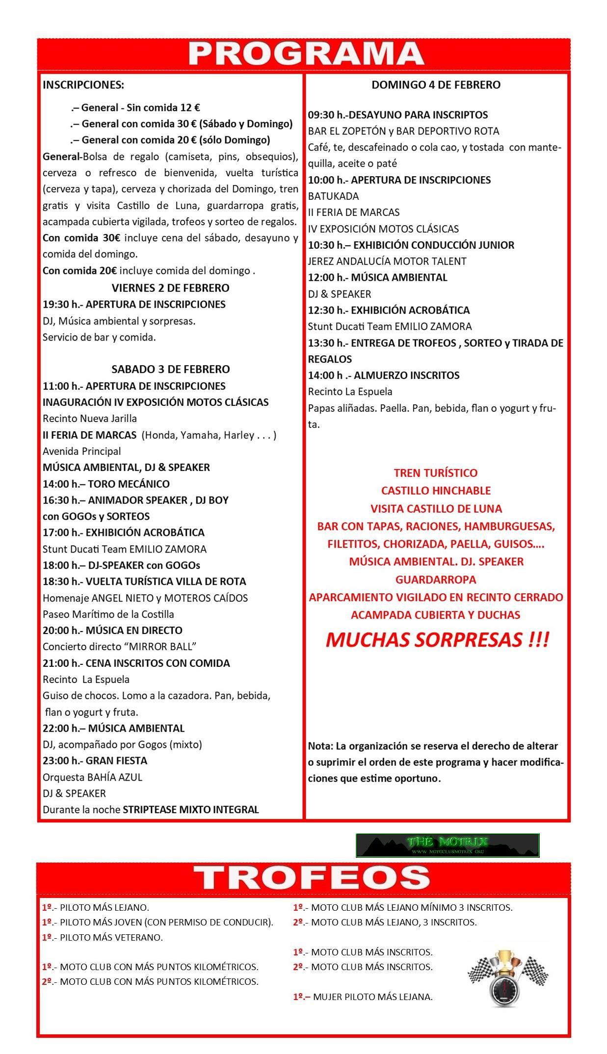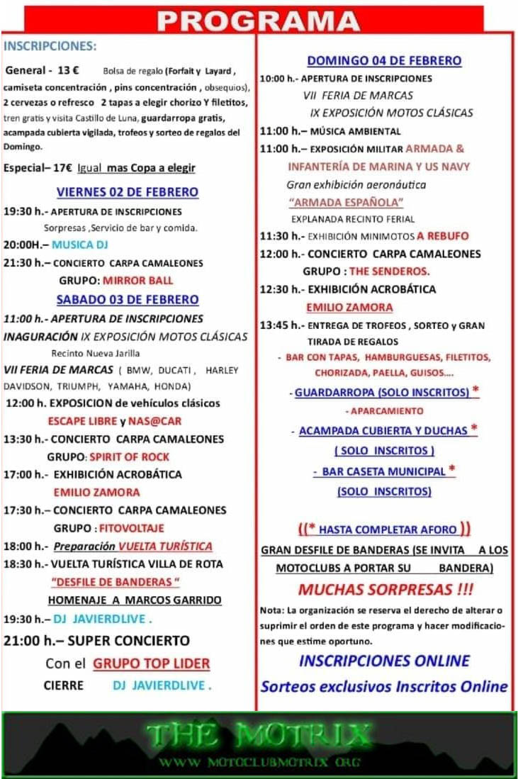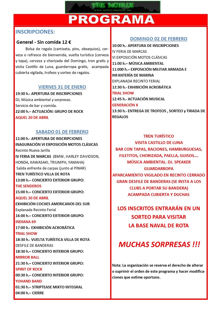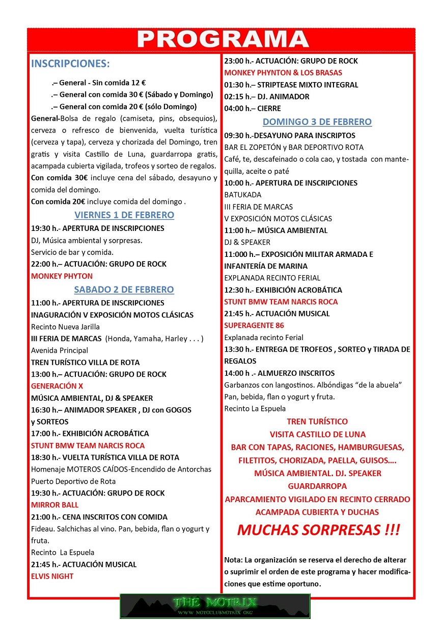 Bolsa regalo, cerveza o refresco de bienvenida, guardarropa, parking y acampada vigilada cubierta y con duchas, zona WI-FI gratis, bar con tapas y raciones, stands moteros, música ambiental, exhibición acrobática, vuelta turística Villa de rota, cena para inscritos, gran fiesta motera, striptease integral mixto, actuaciones musicales y grupos de rock .........