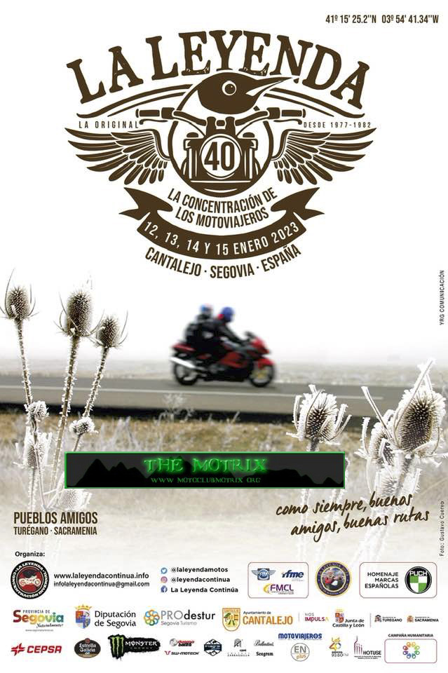 El Moto club La Leyenda Continúa, inicia los preparativos para organizar el 40 aniversario de su concentración invernal “La Leyenda 2023”, la Concentración Motorista Invernal Internacional que tendrá lugar del 12 al 15 de enero próximo y recibir a los miles de motards/moteros/motoristas que procedentes de todo el mundo, se reunirán en la localidad segoviana de Cantalejo.