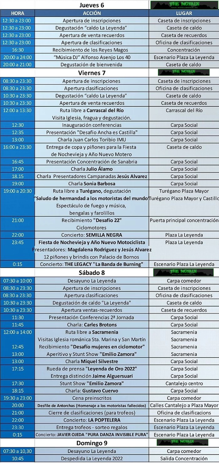 Ante las dudas surgidas que la situación sanitaria nos plantea y después de analizar las informaciones y recomendaciones de las autoridades, tanto nacionales como autonómicas, queremos comunicar que la Concentración Motorista Invernal Internacional “La Leyenda 2022” sigue adelante en su convocatoria en las fechas del 6 al 9 de enero próximo, siempre y cuando la situación y las medidas adoptadas nos lo permitan.