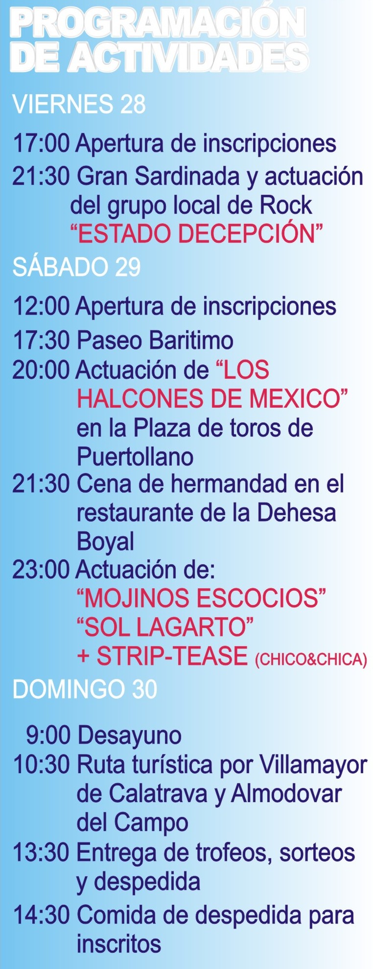 Actividades: Entrega de bolsa de regalos, OKTOBERFET (III fiesta alemana de la cerveza durante todo el evento). Piscina, sardinada, rutas barítima y turística, tapas típicas, cena sábado, desayuno y comida domingo. Fiesta en carpa discoteca, Striptease.