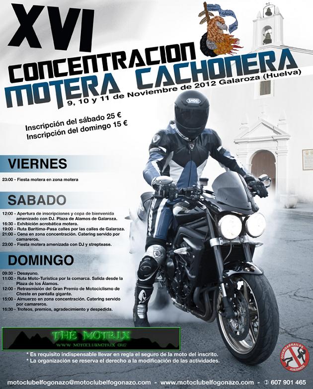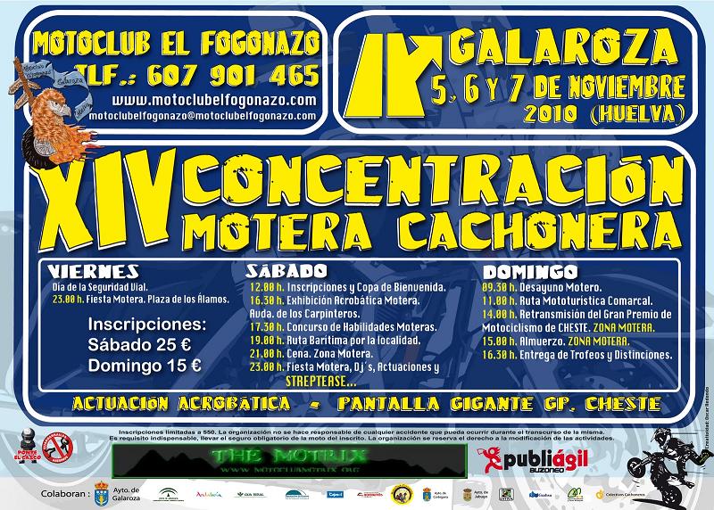 Estimados amigos moteros, os recuerdo que este año nuestra próxima XIV Concentración Motera Cachonera 2010 en Galaroza (Sierra de Huelva) es el primer fin de semana de Noviembre, los días 5, 6 y 7, esperamos vuestra visita como todos los años.