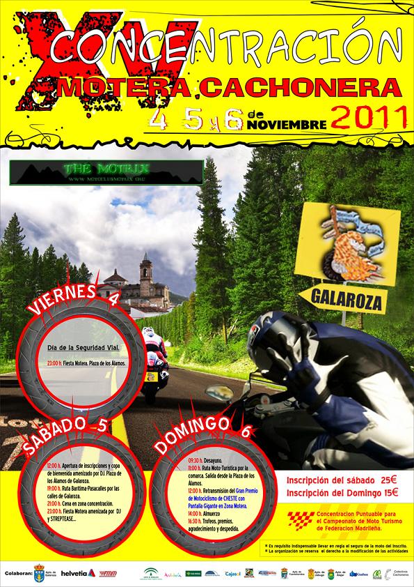 Un año más me dirijo a ti con la intención de comunicarte la próxima celebración de la XV CONCENTRACIÓN MOTERA CACHONERA, a realizar los días 4, 5 y 6 de Noviembre de 2011 en nuestra localidad de Galaroza (Huelva).