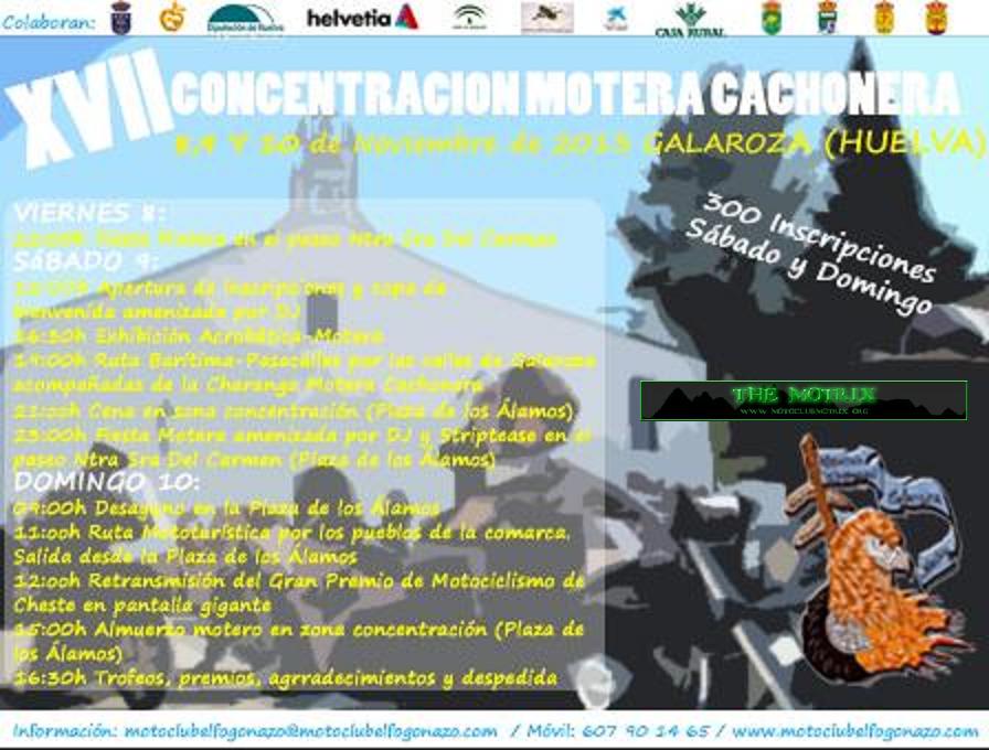 Un año más me dirijo a ti con la intención de comunicarte la próxima celebración de la XVI CONCENTRACIÓN MOTERA CACHONERA, a realizar los días 9, 10 y 11 de Noviembre en nuestra localidad de Galaroza (Huelva).