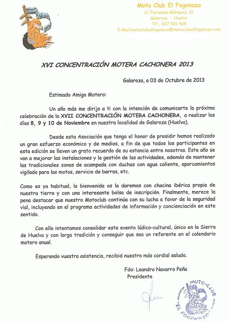Me es grato dirigirme a ti, un año más, con la intención de comunicarte la próxima celebración de la XI CONCENTRACIÓN MOTERA CACHONERA, a realizar los días 3 y 4 de Noviembre en nuestra localidad de Galaroza (Huelva).