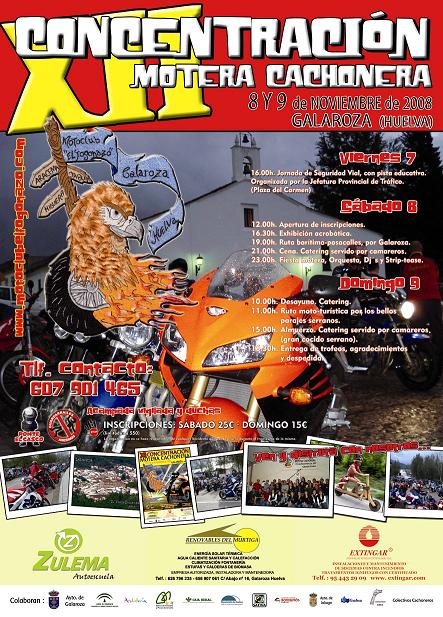 Un año más me dirijo a tí con la intención de comunicarte la próxima celebración de la XII CONCENTRACIÓN MOTERA CACHONERA, a realizar los días 8 y 9 de Noviembre del 2008 en nuestra localidad de Galaroza (Huelva).