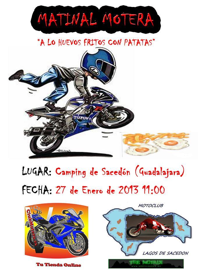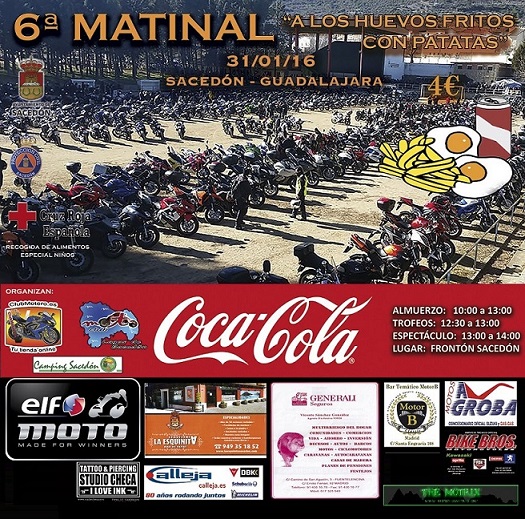 Tenemos el gusto de invitaros a nuestra edicion matinal "a lo huevos fritos con patatas" la cual tenemos programada para el próximo día 26 de enero de 2014. De momento esto es lo que os podemos contar. Eso si, habrá algún regalito y si el tiempo no lo impide, contaremos con nuestro amigo Félix calvete para hacernos unas piruetas acrobáticas con sus motos. Además, como en ediciones pasadas, también tenemos previsto hacer una colaboración de recogida de alimentos para cruz roja, como también podréis conseguir el pin solidario de cruz roja, pero de momento eso es lo que podemos decir y hasta ahí podemos leer...Permanecer atent@s a las próximas publicaciones y como siempre agradecidos a tod@s l@s asistentes deseando paséis una grata jornada motera...nos vemos en breve V´sssss