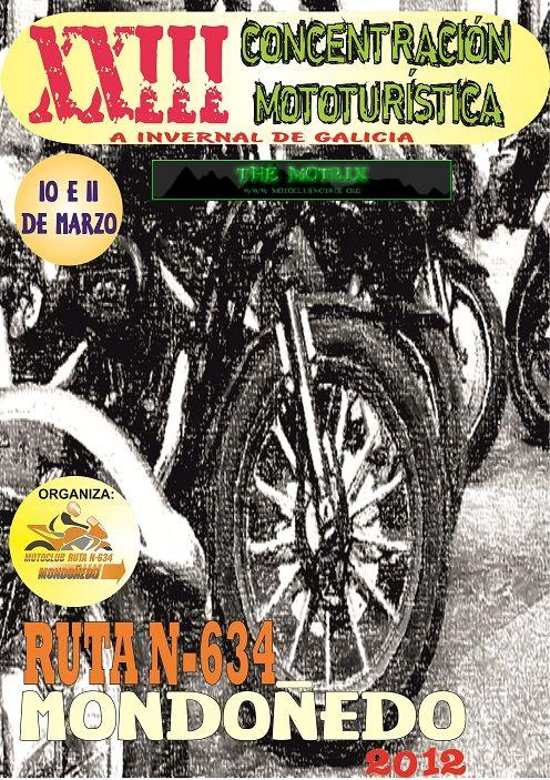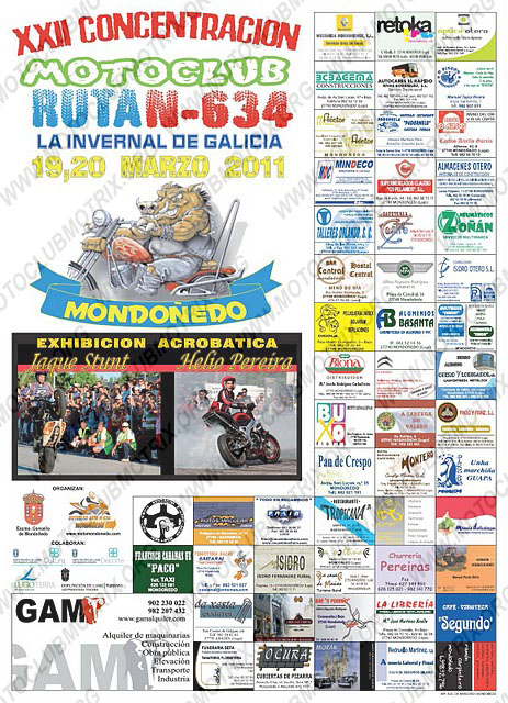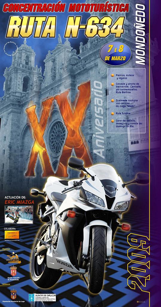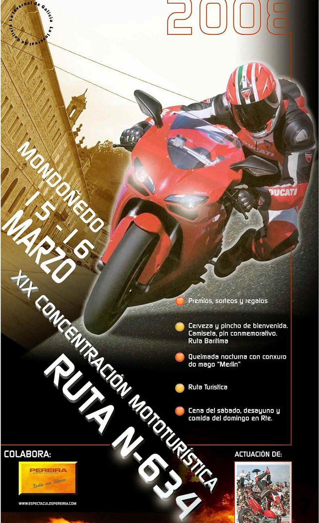 La concentración Ruta N-634 de Mondoñedo (Lugo) llega este año a sudecimonovena edición. Se celebrará los días 15 y 16 de marzo de 2008,segundo fin de semana del mes. Como viene siendo tradicional habrácomidas, cenas, espectáculos moteros y de otro tipo, rutas, premios...