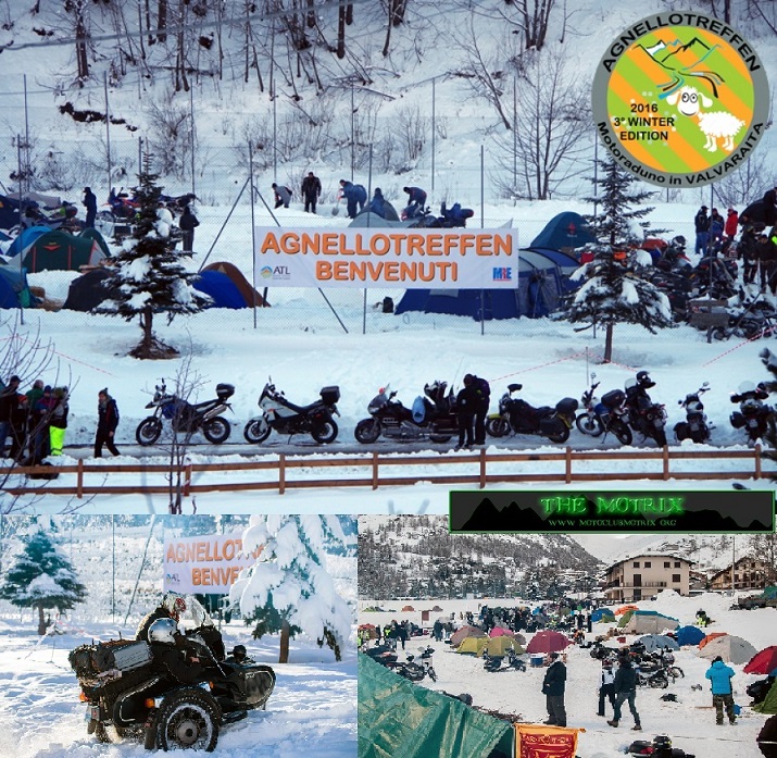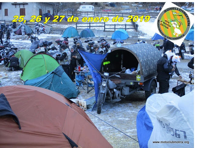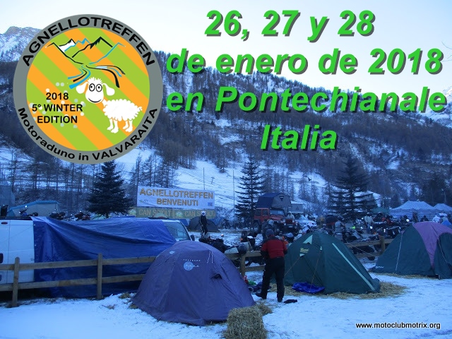El sábado salimos dirección Pontechianale con unos calores que luego echaríamos en falta. Pronto empezamos a serpentear esos colosos alpinos imponentes. El recorrido nos hizo volver a pisar suelo francés para seguidamente volver a tierras italianas. A medida que nos acercábamos se hacía notar el descenso de la temperatura y el volumen de moteros iba creciendo. Poca nieve encontramos por el camino pero al llegar a Pontechianale todo estaba blanco y helado. Con la inscripción daban la milésima del año, un parche y pegatina de la edición, una especie de gorro con el morro de una cabra montesa y la impresión del nombre de la concentración, algo de publicidad y un ticket para la cena que podías utilizar en la carpa o varios bares colaboradores. La zona de acampada se dividía en dos; la mas grande una muy cercana al lago que estaba totalmente helado y otra más hacia el pueblo con el suelo de tierra pero con una fina capa de hielo en la que nos instalemos nosotros. Para paliar el frío suelo vendían unos fardos de paja a 5€ de los que dimos cuenta para montar nuestras tiendas. Era como estar en un congelador ya que estuvimos siempre en negativo. Luego nos acercamos a la zona en la que estaba montada la carpa de la organización donde luego cenaríamos y se celebraría la fiesta. Fuera había un stand de Honda, Suzuki y BMW. Después de visitar los cuatro bares de la zona decidimos ir a cenar. Era una bandeja que contenía una especie de sémola, carne en salsa, queso, pan y un trozo de plum cake. La bebida la tenías que pagar... una caña 3€!!! Hacías cola y tal como se vaciaban las mesas te dejaban acceder a las mesas. La noche la terminamos haciendo ruta por los bares ya que la música de la carpa fue por momentos demasiado electrónica aunque también nos acercamos.