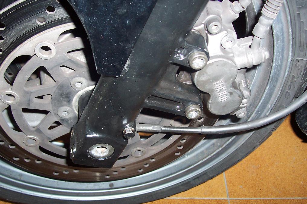 Ahora sí, desmontamos las pinzas, la rueda, el guardabarros y sacamos todos los tornillos y tiramos de la barra para abajo.