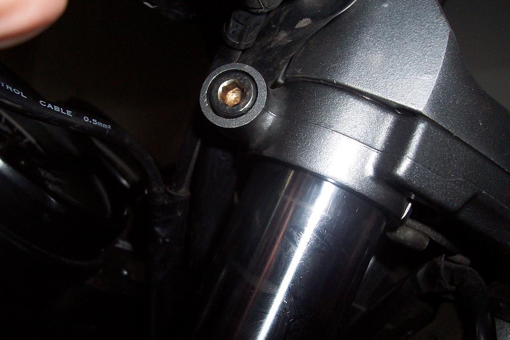 Con las horquillas fuera ,sacamos el tornillo de vaciado del aceite, y dejamos que salga todo en un bote