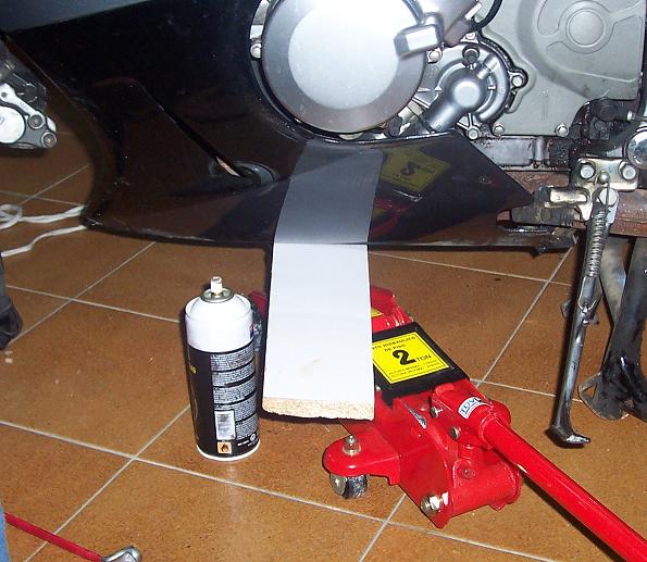 Colocamos un gato para que no se nos venga la moto encima y medimos la distancia que nos sale en la parte superior, que luego hay que dejarla igual.