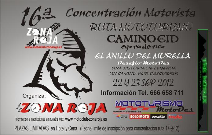 El Moto Club Zona Roja quiere celebrar contigo un año mas su evento mototurístico, este año nuestro 15º los días 24 y 25 de Septiembre de 2011, este año queremos realizar de una manera muy especial, contaremos con una primicia e innovadora idea de recordar y seguir los pasos de una leyenda que hizo historia y así fue escrita por los historiadores que relataron la vida y las conquistas del Cid Campeador, recorreremos parte de esa ruta del Camino del Cid, en este caso “el anillo del maestrazgo” donde podremos seguir siglos mas tarde los pasos de este héroe de guerras y leyendas, tendremos un documento valioso e histórico recordando esta hazaña,”el salvoconducto” que deberá ser cuñado en cada punto de control de este recorrido a fin de recordar y justificar este bonito viaje que recorrerá entre tierras Aragonesas y la Comunidad Valenciana .