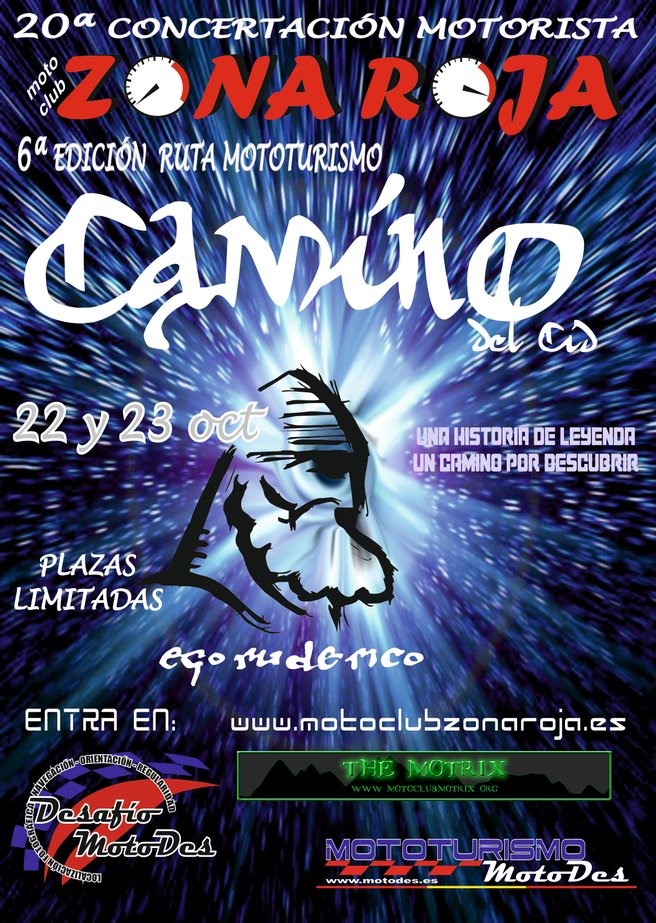 Un año más el Motoclub Zona Roja quiere celebrar contigo su 20ª Concentración Mototuristica, en su 6ª edición del Camino de Cid, los días 22 y 23 de octubre de 2016, realizaremos de nuevo un recorrido maravilloso que no olvidaras por localidades en las cuales tendremos como en anteriores ediciones, visitas guiadas, aperitivos, etc., pasando un fin de semana en lugares con mucho encanto, recorremos contigo montados en nuestras motos los pasos del Cid Campeador, recorreremos la II PARTE DE LA RUTA DE LAS TRES TAIFAS.