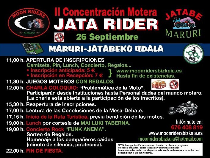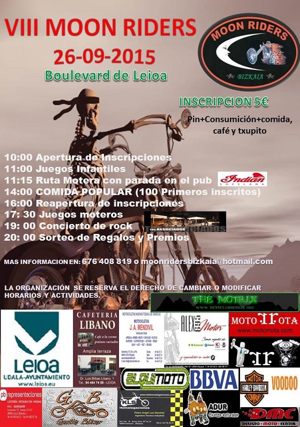 - 11:00 comienzo del I SHOW BIKE ciudad de Leioa con las siguientes categorias :mejor transformacion ,mejor clasica ,mejor sport-racing ,mejor aerografia.