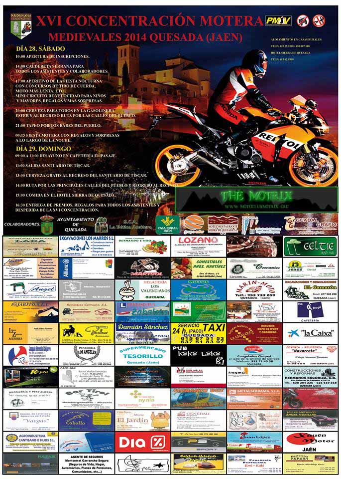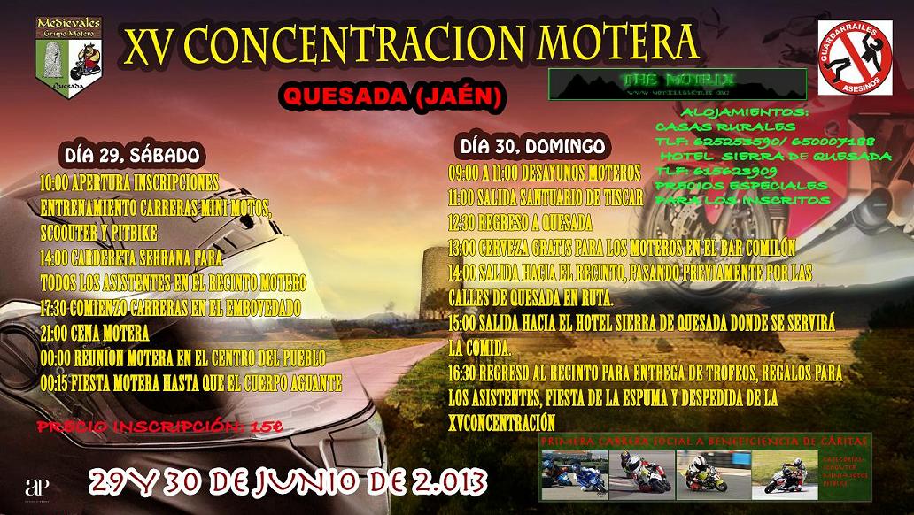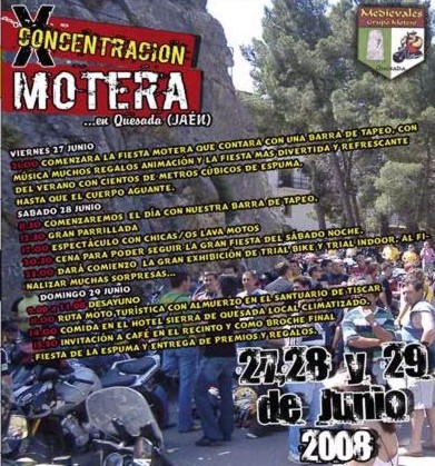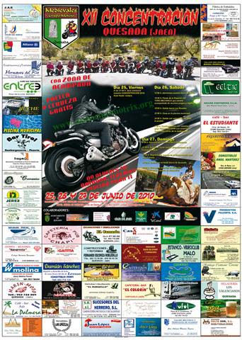 Este año contamos con muchas cosas nuevas entre ellas y la mas importante hemos habilitado una zona de acampada vigilada ,una gran fiesta motera,TORO MECANICO,FIESTA CON ESPUMA,JUEGOS Y alguna sorpresa MAS.El sabado a las 15 horas tendremos paella y cerveza gratis para todos los moteros asistentes a las 19:00 horas salida a la aldea de los rosales con una invitacion a cerveza para todos,regresaremos a quesada para dirijirnos a la piscina para cenar donde degustaremos una cena serrana,una vez finalizada la cena nos dirijiremos al recinto con un paseo por el pueblo con antorchas en homenaje a todos nuestros amigos que por desgracia no nos pueden acompañar y ya comenzaremos nuestra gran fiesta motera que durara hasta que el cuerpo aguante.el domingo tendremos desayuno y subida a el santuario de tiscar donde almorzaremos en la cueva del agua,a las 13:00 horas nos espera una cerveza fresquita y agua para refrescarnos tanto interior como exteriormente.A las 14:30 horas nos dirijiremos al hotel sierra de quesada una vez finalizada la comida se hara la entrega de trofeos y regalos i dara como finalizada nuestra concentracion 2010 os esperamos como todos los años un saludo a todos en forma de V´sssssssssss.