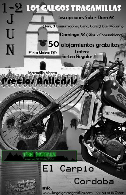 El proximo 1-2 de Junio tendras una cita a partir de las 20:30h. en el recinto ferial de El Carpio, comenzamos el Sabado en la Caseta Municipal, con la cena y despues fiesta motera con Dj Paco Pepe, tenemos alojamiento para los 50 primeros inscritos en el albergue, seguimos el Domingo a partir de las 10:30h. con aperitivos, ruta, sorteo regalos y 15 trofeos.