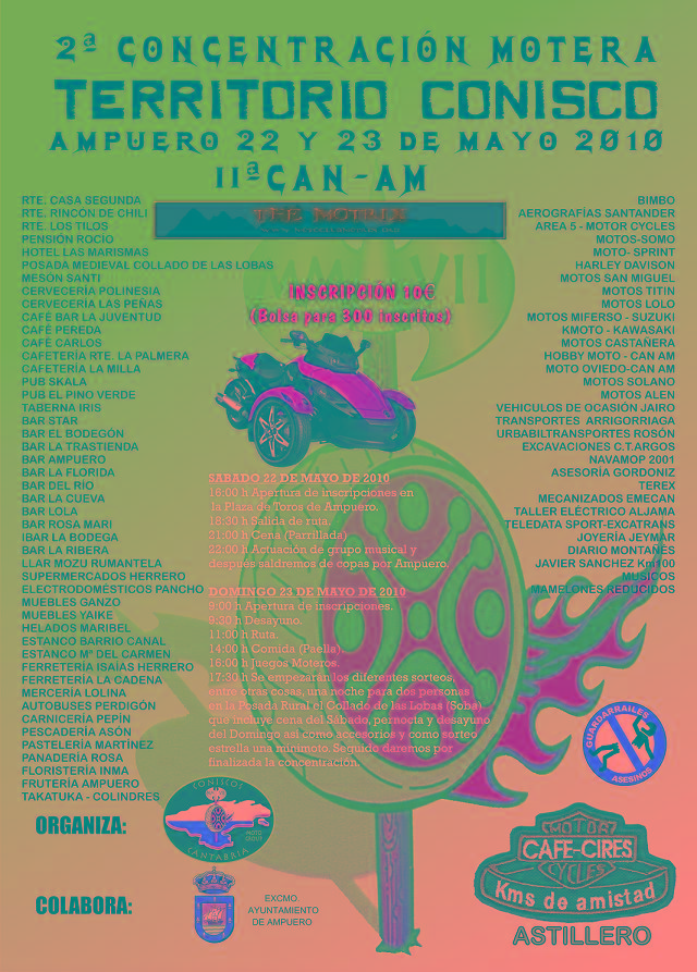 Inscripción 10 euros. Los primeros 300 inscritos recibireís bolsa de regalo. Sorteo para todos los inscritos. Cena del Sábado y desayuno y comida del Domingo más aperitivo en las rutas. Tendremos juegos y actuaciones para ameneizar la concentración. Os esperamos!!!!! Habrá zona de acampada. MOTEROS!!!!! ANIMAROS!!!!!!! VA A SER UNA CONCENTRACIÓN PARA RECORDAR SIEMPRE.