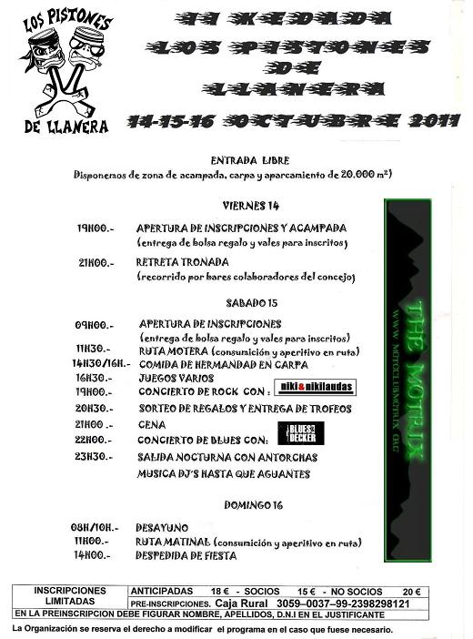Hola chic@s, aquí os dejo el cartel y el programa de nuestra 5ª KEDADA MOTERA "LOS PISTONES DE LLANERA"...en el corazón de Asturias