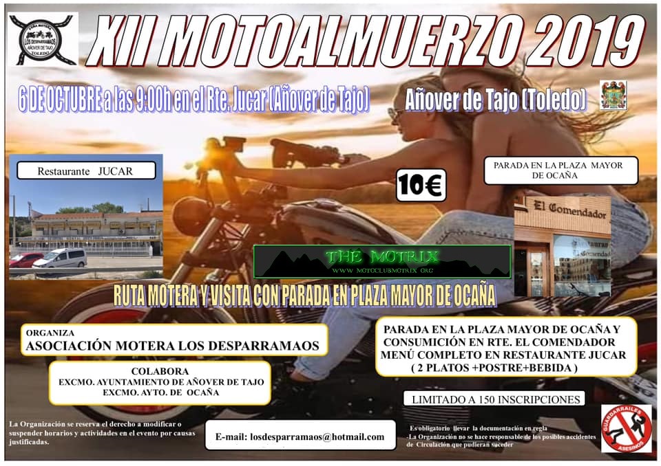 inscripciones: 6 eur. Regalo de pañuelo a los 100 primeros, ruta motera por la Mesa de Ocaña, parada de ruta con consumición y regreso a Añover para comer un Menú motero