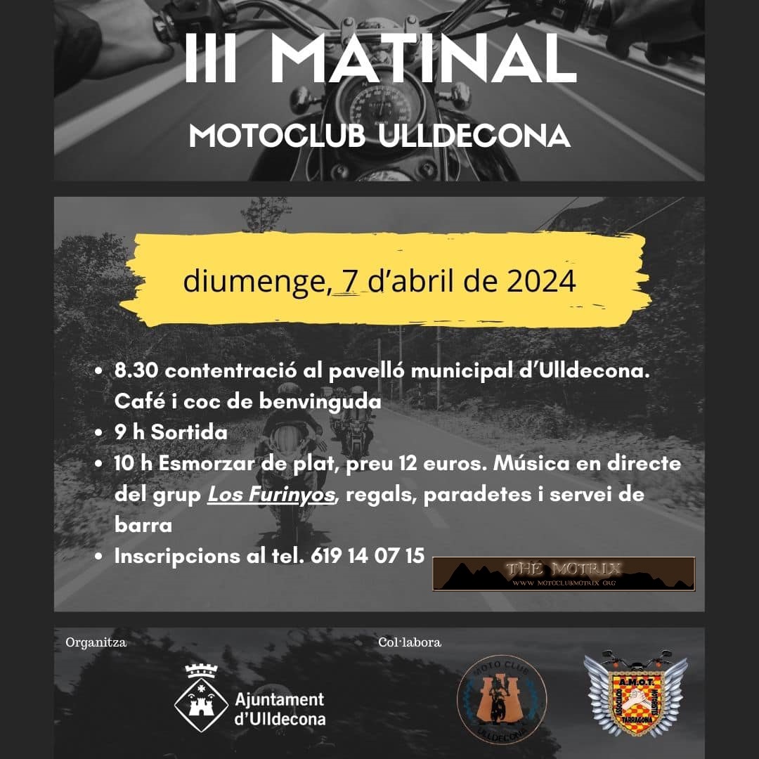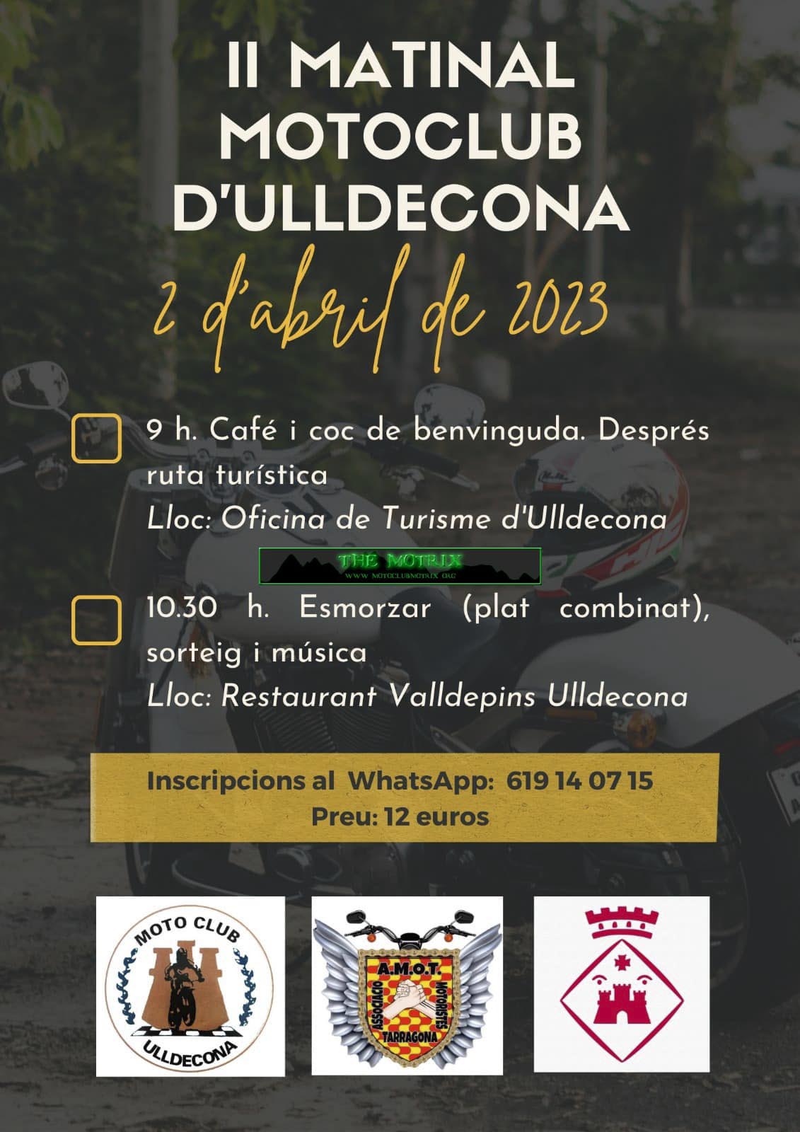 Esmorzar de forquilla , parades de productes moteros ,música en viu amb el grup de rok Furinyos i sorteigs de regals . Obert a tot tipus de motos. Vine a esmorzar en lo Motoclub Ulldecona i gaudir de la matinal encara que no tinguis moto